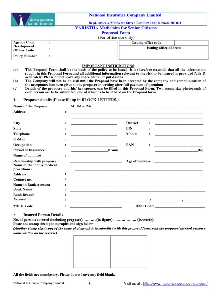 National Insurance Varistha Proposal Form Underwriting Insurance Policy